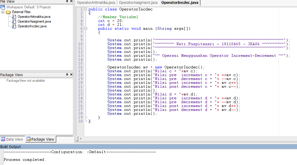 Program dengan variable bebas menggunakan perintah Operator Increment danDecrement (++ I , I ++, - - I,I - -)Listing Program :Output :